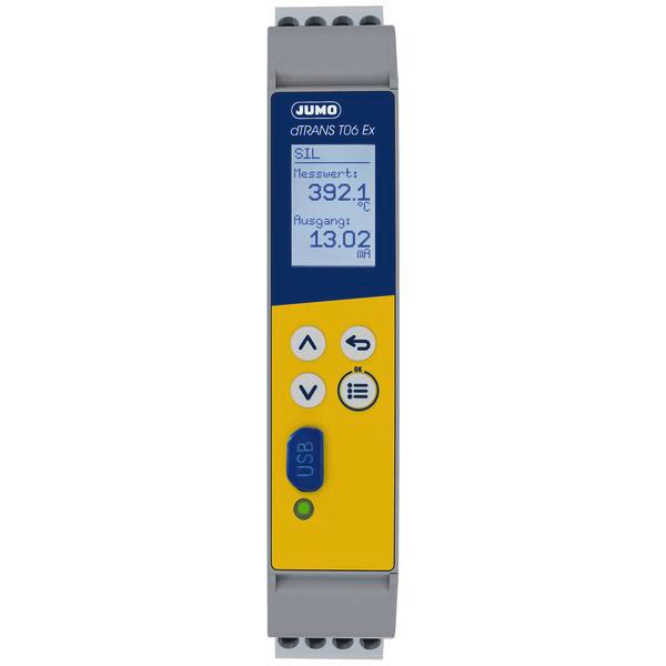 Der Multifunktions-Vierdrahtmessumformer ist dank galvanischer Trennung und kundenspezifischer Linearisierung die Lösung für verschiedenste Anwendungen im Anlagenbau. Mit einer Breite von nur 17,5 mm ist das Einstiegsmodell sehr platzsparend im Schaltschrankeinbau. Er erfasst Sensorsignale von Widerstandsthermometern Dreileiterschaltung. Als Ausgangssignal liefert der Messumformer 0(4) bis 20- mA. Der Messeingang und das Ausgangssignal sind voneinander galvanisch getrennt. Der Multifunktionsmessumformer hat neben der ATEX und IECEx Zulassung eine SIL2 / SIL3 Zulassung nach DIN- EN- 61508 und PL c/d nach ISO 13849. Ein Betriebsstundenzähler gehört auch zur Ausstattung. Die Konfiguration des Messumformers hinsichtlich Fühlerart, Anschlusstechnik des Fühlers, Betriebsstundenzähler, Messbereich (frei einstellbar) und Linearisierung erfolgt mit Hilfe eines Setup-Programms am PC. Die Verbindung mit dem PC wird über eine USB-Schnittstelle, welche keine zusätzliche Hilfsspannung benötigt, hergestellt. Über die USB-Schnittstelle kann der vom Messumformer erfasste Min.-/Max.-Prozesswert sowie die Min.-/Max. -Betriebstemperatur ausgelesen und die Sensorverdrahtung online überprüft werden. Die Betriebszustände des Messumformers werden über eine 3-farbige LED (rot/grün) signalisiert.