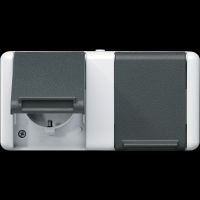 | Kurzbeschreibung | SCHUKO®-Zweifach-Steckdose mit Trennsteg, 16 A 250 V ~, waagerecht, IP 44, WG 800, anthrazit |