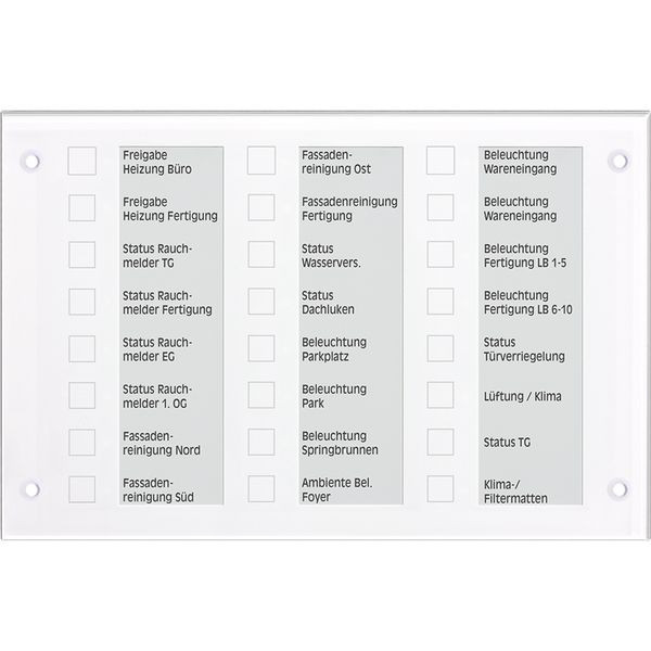 Das Tableau mit Aluminiumgehäuse und hochwertiger Glasfront besitzt 24 unabhängige kapazitive Sensortasten und 24 RGB-LEDs zur Statusanzeige, die über Folienstreifen beschriftbar sind.