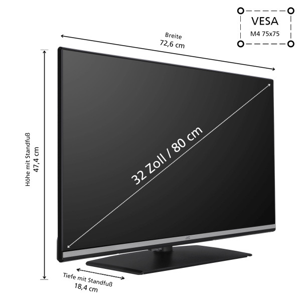 32 Zoll / 80 cmFull HD (1.920 x 1.080)VIDAAHDR10 + HLG2x HDMI, 1x USB, Digitaler Audio Ausgang, LAN, CI-SchachtWLANAusgangsleistung 2x6 WattDolby Digital Plus (DD+)VESA M4 75x75