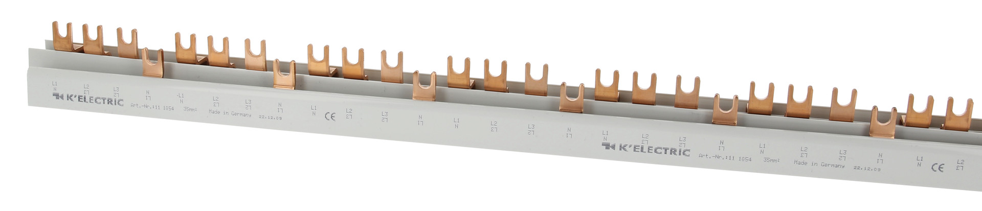 Gabel-Verdrahtungsschiene, 4-polig, 35mm², 56TE, zzgl. Metallzuschläge Phasenfolge: L1,L2,L3,N... Anzahl der Module: 56 TE Länge: 1000mm Endkappe: (3pol)171006 & (1pol)171005 Sägbar: Ja 4. pol. TYTAN T & 4.pol. FI oder LS für Doepke, Eaton, GE, Legrand, Hager