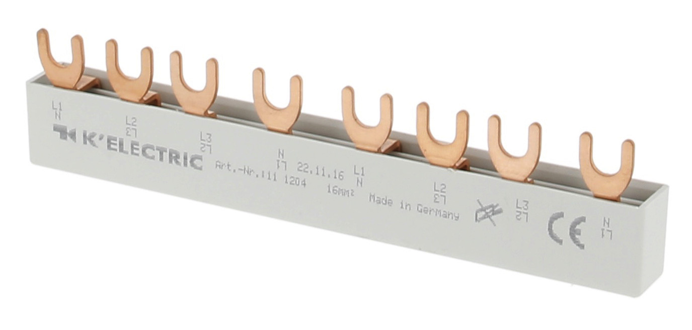 | Kurzbeschreibung | Gabel-Verdrahtungsschiene, 4-polig, 16mm², 8TE, zzgl. Metallzuschläge |