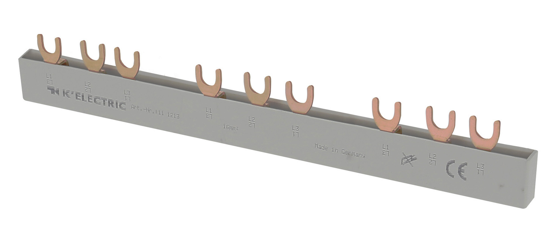 | Kurzbeschreibung | Gabel-Verdrahtungsschiene, 3-polig+17,8mm, 16mm², 9TE (3x3-pol), zzgl. Metallzuschläge |