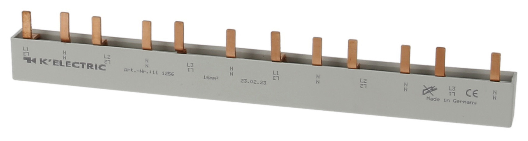 | Kurzbeschreibung | Steg-Verdrahtungsschiene, 4-polig, L1,N,L2,N,L3,N, 16mm², 12TE, zzgl. Metallzuschläge |