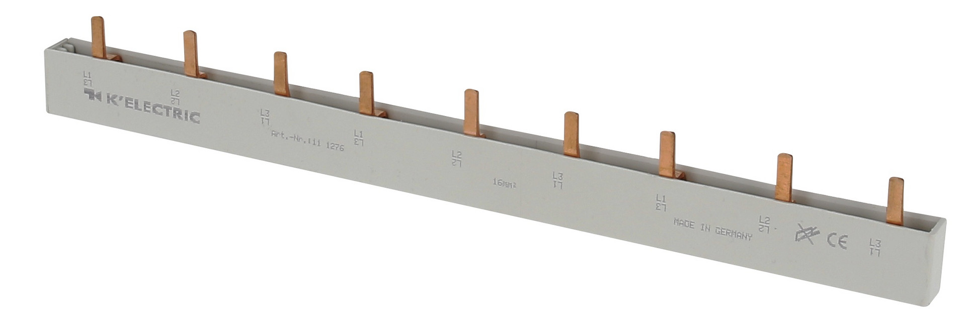 | Kurzbeschreibung | Steg-Verdrahtungsschiene, 3-polig, 16mm², 9TE, 27mm, zzgl. Metallzuschläge |