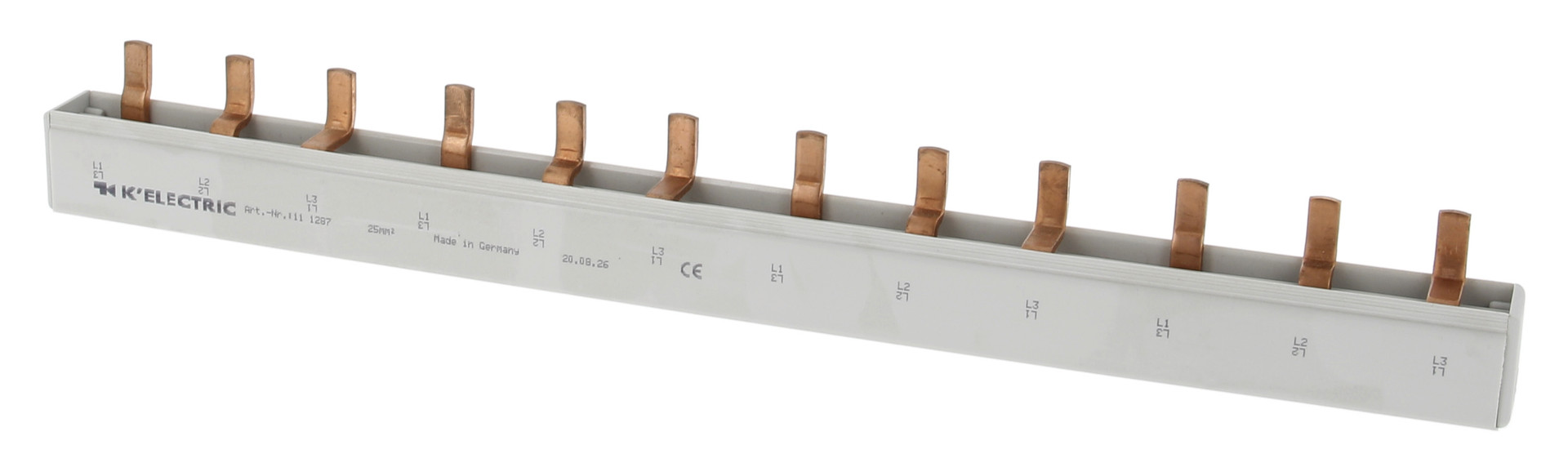 | Kurzbeschreibung | Steg-Verdrahtungsschiene, 4-polig, 25mm², 12TE, 27mm, zzgl. Metallzuschläge |