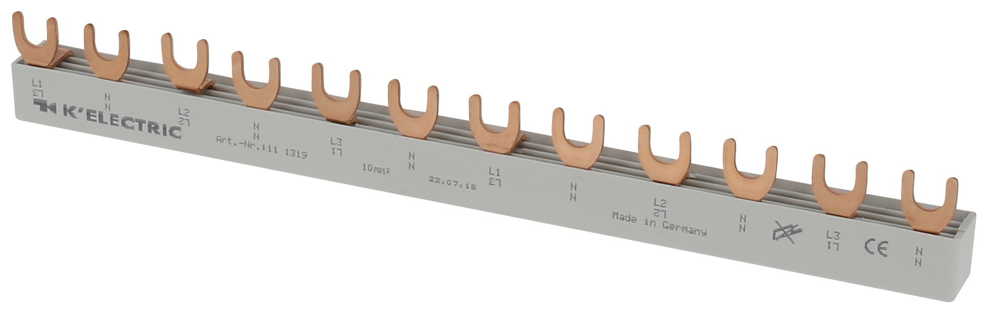 | Kurzbeschreibung | Gabel-Verdrahtungsschiene, 4-polig, L1,N,L2,N,L3,N, 10mm², 12TE, zzgl. Metallzuschläge |