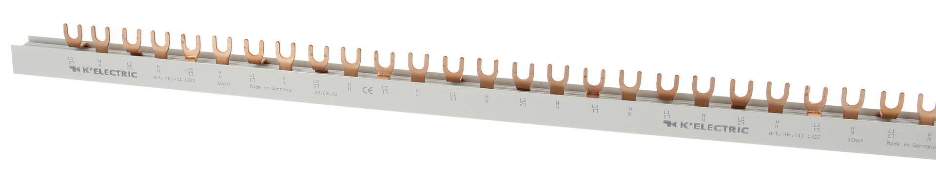 | Kurzbeschreibung | Gabel-Verdrahtungsschiene, 4-polig, L1,N,L2,N,L3,N, 16mm², 54TE, zzgl. Metallzuschläge |