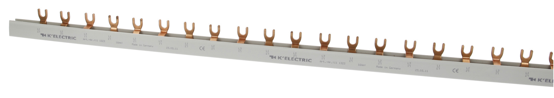 | Kurzbeschreibung | Gabel-Verdrahtungsschiene, 3-polig, 16mm², 36TE, 27mm, zzgl. Metallzuschläge |
