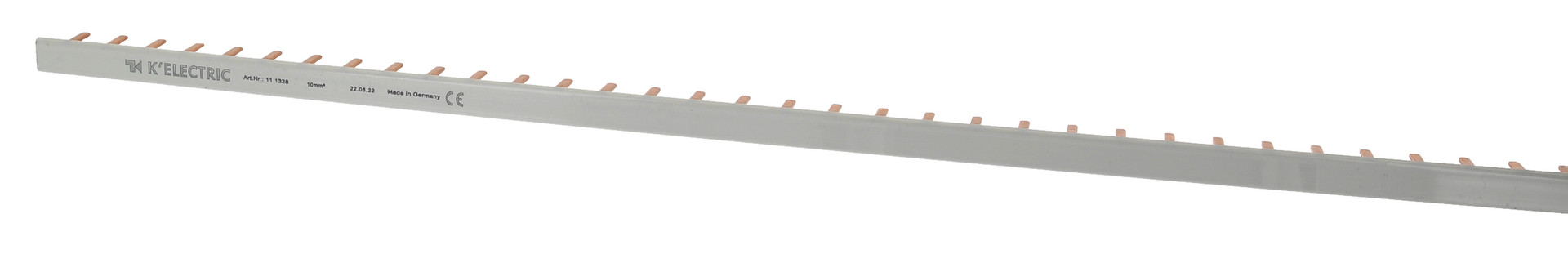 Steg-Verdrahtungsschiene, 1-polig, 10mm², 57TE, 17,6mm, 90° gebogen, iso, zzgl. Metallzuschläge