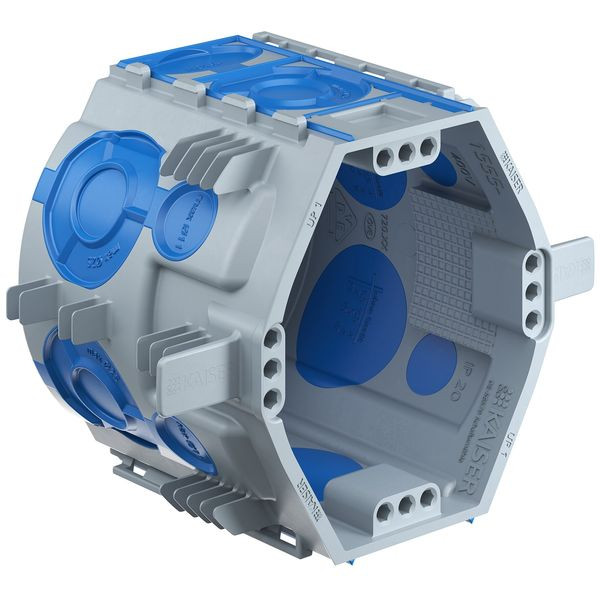 Geräte-Verbindungsdose mit mehr Volumen, luftdicht mit Multimembran, für Unterputz/Mauerwerksinstallation, Unterputzdose, Ausführung als Unterputz-Geräte-Verbindungsdose nach DIN EN 60670/VDE 0606 und DIN 49073, aus Kunststoff, luftdichte Ausführung nach DIN 18015-5, Installationsöffnung Ø 60 mm, Einbauöffnung Ø 82 mm, Tiefe 66 mm, Kombinationsabstand 71 mm, mit Fixierung für die Installation ohne Gips, Schutzart IP 20 nach DIN EN 60529, flammwidrig nach DIN EN 60695 bis 650° C, halogenfrei nach DIN VDE 0604-2-100, für Unterputzinstallation. Werkzeuglose Einführungen für Leitungen und DIN EN Rohre Durchmesser 20/25 mm (2 x 20 mm/25 mm in beiden Kombinationsflächen, 4 x 20 mm/25 mm in der Seitenwand) jeweils mit Segmentierungen für bis zu 4 NYM-Leitungen 3 x 1,5 mm², 3 x 2,5 mm² bzw. 5 x 1,5 mm², 5 x 2,5 mm² bzw. 7 x 1,5 mm², 4 Leitungseinführungen bis Durchmesser 11 mm in der Seitenwand, 2 Leitungseinführungen bis Durchmesser 11 mm in den Kombinationsflächen, 2 Einführungen für DIN EN Rohre Durchmesser 20/25 mm sowie 2 Leitungseinführungen bis Durchmesser 11 mm (3 x 1,5 mm², 3 x 2,5 mm² bzw. 5 x 1,5 mm²) im Dosenboden. offene Durchverdrahtung, bodennahe vollisolierte Durchverdrahtung, mit 4 x 3 Schraubdomen und 2 Spreizkrallenfeldern, ohne Geräteschrauben