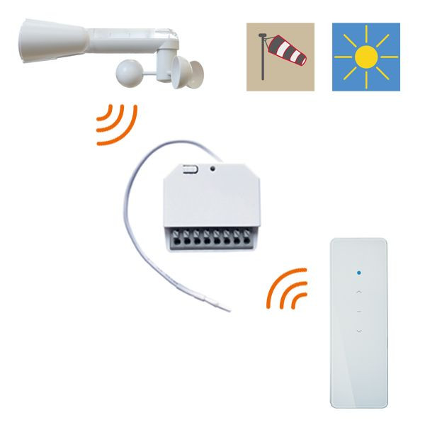 | Kurzbeschreibung | Funk-Sonnen-/ Windsteuerung, UP-Empfänger + Funk-Sensor + Funk-Handsender |