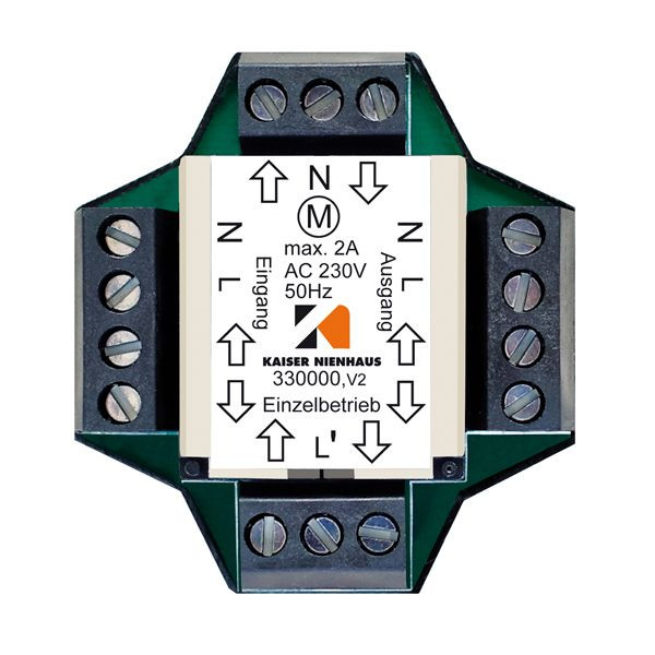 Mit diesem einfachen Trennrelais für ein oder zwei Motoren können viele Gruppensteuerungen realisiert werden. Es kann entweder zur Trennung von zwei Motoren genutzt werden, welche über einen gemeinsamen Schalter angesteuert werden sollen, oder zum Aufbau einer hausweiten Steuerung mit Zentral-, Gruppen- und Einzelbedienungen. Da es sich um ein mechanisches Trennrelais ohne integrierte Logik handelt gibt es zwar keine einstellbaren Parameter, jedoch ist die Haltbarkeit und Zuverlässigkeit unübertroffen. Durch hochwertige Kontakte halten die Geräte so bis zu 1.000.000 Einschaltungen aus. Die Steuer- und Versorgungsspannung beträgt 230V (50Hz). Die Vor-Ort-Bedienung, welche einen der beiden Motorenausgänge ansteuert, benötigt keine externe Spannungsversorgung. Die Schraubkontakte überstehen bei sachgemäßem Umgang viele Öffnungen und Schließungen. Beide Bedienungen (Zentral und Vor-Ort) arbeiten im Totmannbetrieb, wobei der Zentraleingang die höhere Priorität hat. In Kombination mit dem Gerät sollten ausschließlich Jalousietaster verwendet werden. Mit einer Bautiefe von gerade einmal 21mm ist das Gerät ideal für den Einsatz in Unterputzdosen geeignet. Abmessungen: 52x48x21mm