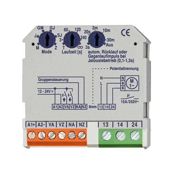 Dieses Mehrfachsteuergerät wird hauptsächlich als vorgeschaltetes Gruppensteuergerät in Rollladen- oder Jalousiesteuerungen verwendet. Es handelt sich um ein intelligentes Steuergerät mit einem Steuerausgang und zwei Steuereingängen. Durch die Flankensteuerung wird eine geschaltete Laufrichtung nach Ablauf der eingestellten Laufzeit auch bei weiter anstehendem Steuerbefehl zurückgestellt. Neben dem Einsatzzweck (z.B. Gruppensteuerung f. Rollladenantriebe, Gruppensteuerung f. Jalousieantriebe, Einzelsteuerung Rollladenantriebe, etc.) lassen sich über die Dreh-Potenziometer am Gerät noch die Laufzeit zwischen 3 und 240 Sekunden einstellen sowie ein automatischer Rücklauf zwischen 3 Sekunden und 30 Minuten aktivieren. Die Vor-Ort-Bedienung arbeitet mit einer Selbsthaltung entsprechend der eingestellten Laufzeit während die vorrangige Zentralbedienung im Totmannbetrieb arbeitet. Als Bedienelement können Taster, Schalter und Zeitschaltuhren eingesetzt werden. Die Steuer- und Versorgungsspannung beträgt 12-24V UC und die Schaltspannung beträgt 230V (50Hz). Die hochwertigen Schraubklemmen haben unverlierbare Schrauben und halten viele Öffnungen und Schließungen aus. Mit einer Bautiefe von gerade einmal 19mm ist das Gerät ideal für den Einsatz in Unterputzdosen geeignet. Abmessungen: 43x43x19mm