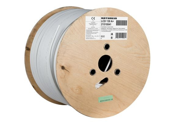 Koaxialkabel, BauPVO EN 50575-B2ca s1a d0 a1, 500 m Einwegtrommel, 6,9 mm, PVC weiss, Schirmungsmass typ. 130 dB, Schirmungsklasse A Plus Plus, Metermarkierung, Aufbau typ. 1,13 Cu 4,8 Al CuSn Al, Folie verklebt, KDG Vodafone-Freigabe, Einsatz bei Fluchtwegen, Krankenhaeusern, Kindergaerten, etc.