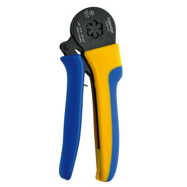 Presswerkzeug für Aderendhülsen und Zwillingsaderendhülsen 0,14 - 10 mm², Sechskantpressung, sehr leicht und ergonomisch, ein Pressprofil für alle Querschnitte durch automatische Querschnittanpassung, mit Sperrvorrichtung für gleichmäßig kontrollierte Pressergebnisse, seitliche Hülseneinführung (Seitenpressung), Handgriffe mit Abgleitschutz und Beschriftungsfeld, Sicherheitspad im Griff für abrutschsicheres Arbeiten
