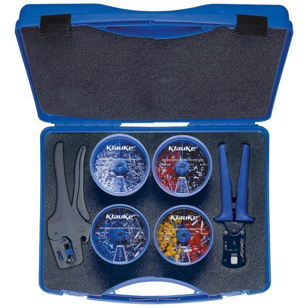Abmessungen: 395x295x106 mm, Lieferumfang: Automatische Abisolierzange K43/2 0,02 - 10 mm² (K432) 1 Stück, Presswerkzeug für Aderendhülsen und Zwillingsaderendhülsen 0,08 - 10 mm² (K303) 1 Stück, isol. Aderendhülse DIN 46228 Teil 4, 0,5 mm², 14mm Länge (4698) 400 Stück, isol. Aderendhülse DIN 46228 Teil 4, 0,75 mm², 14mm Länge (4708) 400 Stück, isol. Aderendhülse DIN 46228 Teil 4, 1 mm², 14mm Länge (4718) 400 Stück, isol. Aderendhülse DIN 46228 Teil 4, 1,5 mm², 14mm Länge (4728) 400 Stück, isol. Aderendhülse DIN 46228 Teil 4, 2,5 mm², 14mm Länge (4738) 200 Stück, isol. Aderendhülse DIN 46228 Teil 4, 4 mm², 17mm Länge (47410) 200 Stück, isol. Aderendhülse DIN 46228 Teil 4, 6 mm², 20mm Länge (47512) 100 Stück, isol. Aderendhülse DIN 46228 Teil 4, 10 mm², 22mm Länge (47612) 100 Stück.