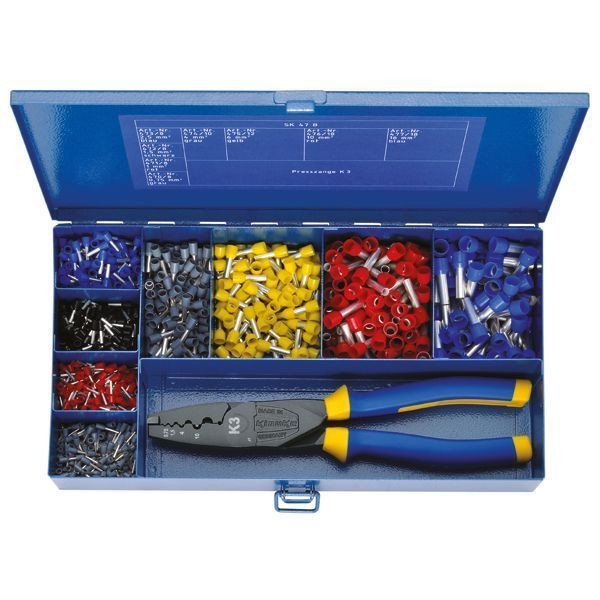 | Kurzbeschreibung | Sortimentskasten aus Stahl mit isolierten Aderendhülsen und Presswerkzeug. SK47B |