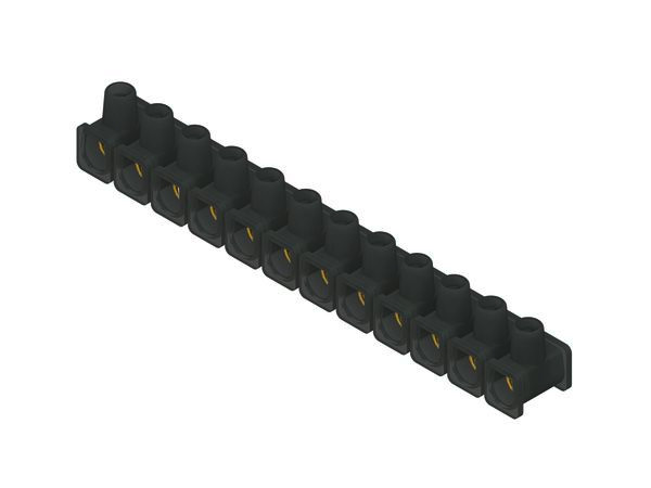 Verbindungsklemme nach DIN EN 60998, mit 12 abtrennbaren Klemmstellen, einseitig geschlossen, halogenfrei. Abmessungen (ca. Maße) H x B x L : 17,5 x 15 x 122 mm Klemmbereich eindrähtig, starr, flexibel : 1,5 - 4,0 mm² Anschlussmöglichkeiten eindrähtig : 5 x 1,5 mm², 4 x 2,5 mm², 2 x 4,0 mm² Anschlussmöglichkeiten starr, flexibel : 4 x 1,5 mm², 3 x 2,5 mm², 2 x 4,0 mm² Werkstoff Isolierteil : PA Werkstoff Klemmbolzen : Messing Werkstoff Klemmschrauben : galvanisch verzinkter Stahl Max. Umgebungstemperatur nach EN 60998 : T85 Nennspannung : 450 V Farbton : schwarz