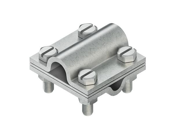 Kreuz-Verbinder nach DIN EN 62561 (VDE 0185-561) inkl. Klemmplatte mit Sechskantschrauben nach DIN EN ISO 4017 und Sechskantmuttern nach DIN ISO 4032, für Verbindungen im Beton. Abmessungen (ca. Maße) Klemmplatten B x L x t : 60 x 60 x 4 mm Verbindungsmöglichkeiten : 1 Rundleiter Ø8 - Ø10 mm (1318/10, 2318/10) 1 Rundleiter max. Ø16 mm Werkstoff Verbinder : Stahl, feuerverzinkt Werkstoff Schrauben/Muttern : Stahl, feuerverzinkt