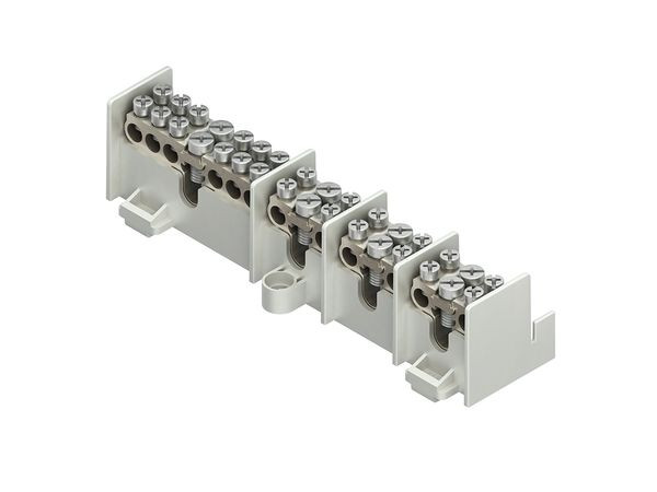 Hauptleitungs-Abzweigklemme 35 mm² nach DIN VDE 0603-3-1, zur Befestigung in Längs- und Querrichtung auf Tragschiene TS 35 mm deren Anschlussmaße DIN EN 60715 entsprechen, halogenfrei. Abmessungen (ca. Maße) Höhe H x Breite B x Länge L : 43 x 52,5 x 182,5 mm Klemmbereich Zugang eindrähtig, starr : 16,0 - 35,0 mm² Anschlussmöglichkeiten Zugang eindrähtig, starr : 2 x 16,0 mm², 2 x 25,0 mm², 2 x 35,0 mm² Klemmbereich Abgang eindrähtig, starr : 10,0 - 25,0 mm² Anschlussmöglichkeiten Abgang eindrähtig, starr : 1 x 10,0 mm², 1 x 16,0 mm², 1 x 25,0 mm² Polzahl : 4 Werkstoff Isolierteil : PA Werkstoff Polklemme : galvanisch vernickelter Messing Werkstoff Klemmschrauben : galvanisch verzinkter Stahl mit Kombi-Kreuzschlitz Nennspannung : 400 V Farbton : lichtgrau RAL : 7035 (ähnlich)