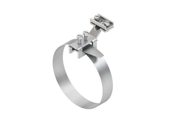 | Kurzbeschreibung | Erdungs-Bandschelle, längs, Bandlänge 412 mm, für Rohr-Ø 25-114 mm, Messing, vernickelt |