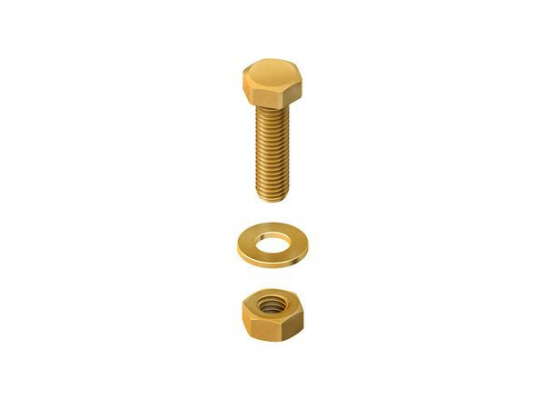 Kontaktschraube, mit Sechskantschraube nach DIN EN ISO 4017 einschließlich Sechskantmutter nach DIN EN ISO 4032 und Unterlegscheibe nach DIN EN ISO 7089-Form A. Gewinde : M 10 Länge : 20 mm Werkstoff : Messing, blank