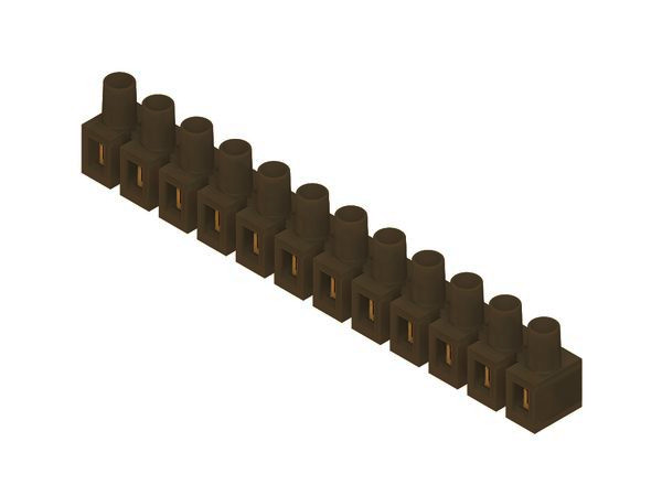 Verbindungsklemme nach DIN EN 60998, mit 12 abtrennbaren Klemmstellen, halogenfrei. Abmessungen (ca. Maße) H x B x L : 27,5 x 17,5 x 165 mm Klemmbereich eindrähtig, starr : 4,0 - 10,0 mm² Anschlussmöglichkeiten eindrähtig, starr : 5 x 4,0 mm², 3 x 6,0 mm², 2 x 10,0 mm² Werkstoff Isolierteil : PA Werkstoff Klemmbolzen : Messing Werkstoff Klemmschrauben : galvanisch verzinkter Stahl Max. Umgebungstemperatur nach EN 60998 : T85 Nennspannung : 450 V Farbton : braun