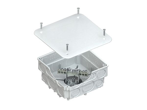 Potentialausgleichsschiene im UP-Kasten, mit herausnehmbarer Klemmschiene, mit ausbrechbaren Kabeleinführöffnungen (4 x Ø 15,8 mm, 12 x Ø 21,2 mm, 4 x Ø 25,8 mm, 4 x variable Ausbrechöffnungen von Ø 14 bis LL Ø 14 x 36 mm). Abmessungen (ca. Maße) H x B x L : 57 x 107 x 107 mm Abdeckungsgröße : 122 x 122 mm Anschlussmöglichkeiten : 1 x 6 - 16 mm² (ungeschnitten ) 6 x 1,5 - 10 mm² Werkstoff Klemmschiene : Messing, vernickelt