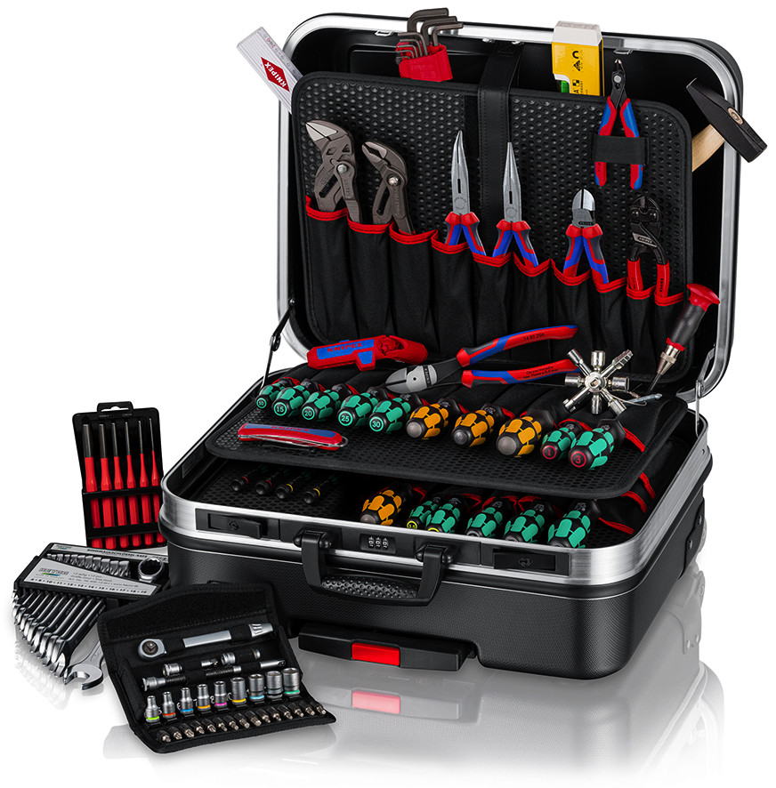 Bestückt mit 12 KNIPEX-Werkzeugen, insgesamt 90 Markenwerkzeugen. Im Boden eingelassener Teleskopgriff sowie zwei außen liegende, leicht laufende Skater-Rollen. Zwei Metall-Kippschlösser und ein dreistelliges Zahlencodeschloss zum sicheren Verschließen des Deckels. Beschriftungsfeld mit zwei Aufklebern zur individuellen Kennzeichnung. Max. Zuladung: 20 kg. 33 Liter Fassungsvermögen. Stabiler, ergonomischer Tragegriff. Strapazierfähige Ausführung aus ABS-Material, schwarz. Umlaufender Aluminiumrahmen. Metallscharniere. Dokumentenfach im Deckel. Zwei herausnehmbare Werkzeugtafeln aus schmutzabweisenden PP-Hohlkammerplatten mit 31 bestückbaren Werkzeugtaschen. Bodenschale, per Druckknopf fixierbar, Höhe 70 mm, durch Einsätze weiter unterteilbar und Abdecktafel mit 14 großen Werkzeugtaschen. Insgesamt 54 Steckmöglichkeiten. - Abmessung Breite außen (innen): 430mm 350mm - Abmessung Höhe außen (innen): 280mm 200mm - Abmessung Tiefe außen (innen): 515mm 480mm