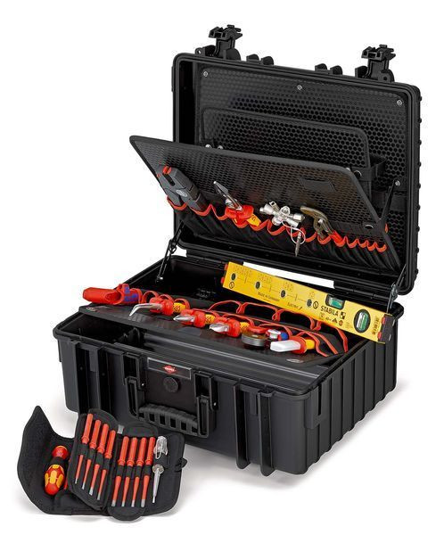 00 21 36 Werkzeugkoffer "Robust34" Elektro Bestückt mit 26 Markenwerkzeugen, teilweise VDE-geprüft nach DIN EN 60900. Insgesamt 93 Steckmöglichkeiten. Max. Zuladung: 25 kg. 34 Liter Fassungsvermögen. Für härteste Einsatzbedingungen: Staub-, wasserdicht und temperaturbeständig. Flugtauglicher Koffer aus schlagfestem Polypropylen. Staub- und wasserdicht. Automatisches Druckausgleichventil. Temperaturstabil von -30°C bis +80°C. Vorrichtung für Vorhängeschloss. Dokumentenfach; Werkzeugtafeln aus schmutzabweisenden PP-Hohlkammerplatten mit 42 bestückbaren Werkzeugtaschen und 67 Werkzeugschlaufen. Verschließbare Bodenschale individuell unterteilbar durch Aluminium-Trennstegesystem. Ergonomischer Zweikomponenten-Griff. Bodenwanne mit Aluminiumtrennstegen. Abmessungen, außen (B x H x T): 510 x 419 x 215 mm Abmessungen, innen (B x H x T): 480 x 356 x 199 mm. bestückt mit 26 Markenwerkzeugen; teilweise VDE-geprüft nach DIN EN/IEC 60900. - Abmessung Breite außen (innen): 510mm 480mm - Abmessung Höhe außen (innen): 215mm 199mm - Abmessung Tiefe außen (innen): 419mm 356mm Lieferumfang: 1 x 12 40 200 KNIPEX EvoStrip Selbsteinstellende Abisolierzangen (0,03 – 10,0 mm²), 1 x 12 40 200 KNIPEX EvoStrip Selbsteinstellende Abisolierzangen (0,03 – 10,0 mm²), 1 x 00 11 01 Knipex TwinKey® Schaltschrankschlüssel der Standard Schaltschrankschlüssel (92 mm), 1 x 98 52 KNIPEX Kabelmesser (190 mm), 1 x 97 53 04 KNIPEX Selbsteinstellende Crimpzange für Aderendhülsen mit Seiteneinführung (0,08 – 10 + 16 mm²), 1 x 08 26 145 KNIPEX Spitz-Kombizange (145 mm), 1 x 87 01 180 Knipex Cobra® Hightech-Wasserpumpenzange (180 mm), 1 x 13 86 200 KNIPEX Elektro-Installationszange (Ø 15 mm / 50 mm²), 1 x 16 95 01 SB KNIPEX ErgoStrip® Universal-Abmantelungswerkzeug für Rechtshänder (Ø 8,0 – 13,0 mm), 1 x 70 06 160 Knipex Seitenschneider (160 mm), 1 x 003484 Wera Kraftform Kompakt VDE 16 Slim, 1 x 16135 Stabila Wasserwaage Typ 70 Electric (430 mm),