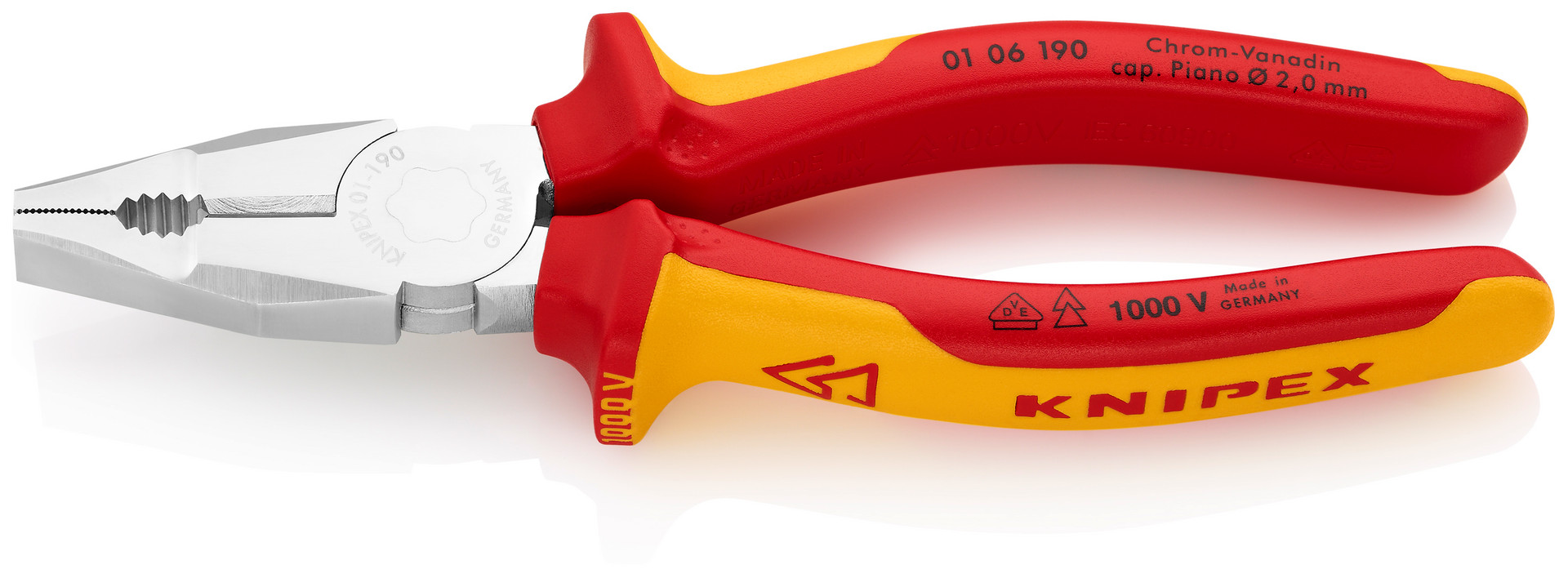 | Kurzbeschreibung | KNIPEX 01 06 190 Kombizange Chrom-Vanadin isoliert mit Mehrkomponenten-Hüllen, VDE-geprüft verchromt 190 mm |