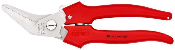 95 05 185 Kombischere Zum Schneiden von Pappe, Kunststoff, Al-, Ms- und Cu-Folien. Nicht für Stahldraht und Eisenblech geeignet. Gehärtete Schneiden mit Präzisionsschliff. Mit Öffnungsfeder und Sperrklinke. Klemmschutz verhindert Quetschverletzungen. Nachstellbares Schraubgelenk. gewinkelte Form - für einfacheres Ausführen langer Schnitte. ergonomisch geformte Kunststoffgriffe. Schneidenlänge 40 mm.