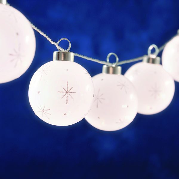 8 satinierte Glaskugeln, Ø 8 cm, mit 40 warm-weißen LEDs, Verbrauch ca. 0,24 W, Kugelabstand: 30 cm. L: 210 cm, mit Innentrafo, transparente Zuleitung: 400cm