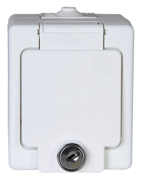 STANDARD - Aufputz Feuchtraum Steckdose, 1-fach, mit Klappdeckel, abschließbar, Nennstrom 16A, Bemessungsspannung 250V~, Schaltvermögen 10AX, Schutzart IP44, Farbe: arktisweiß