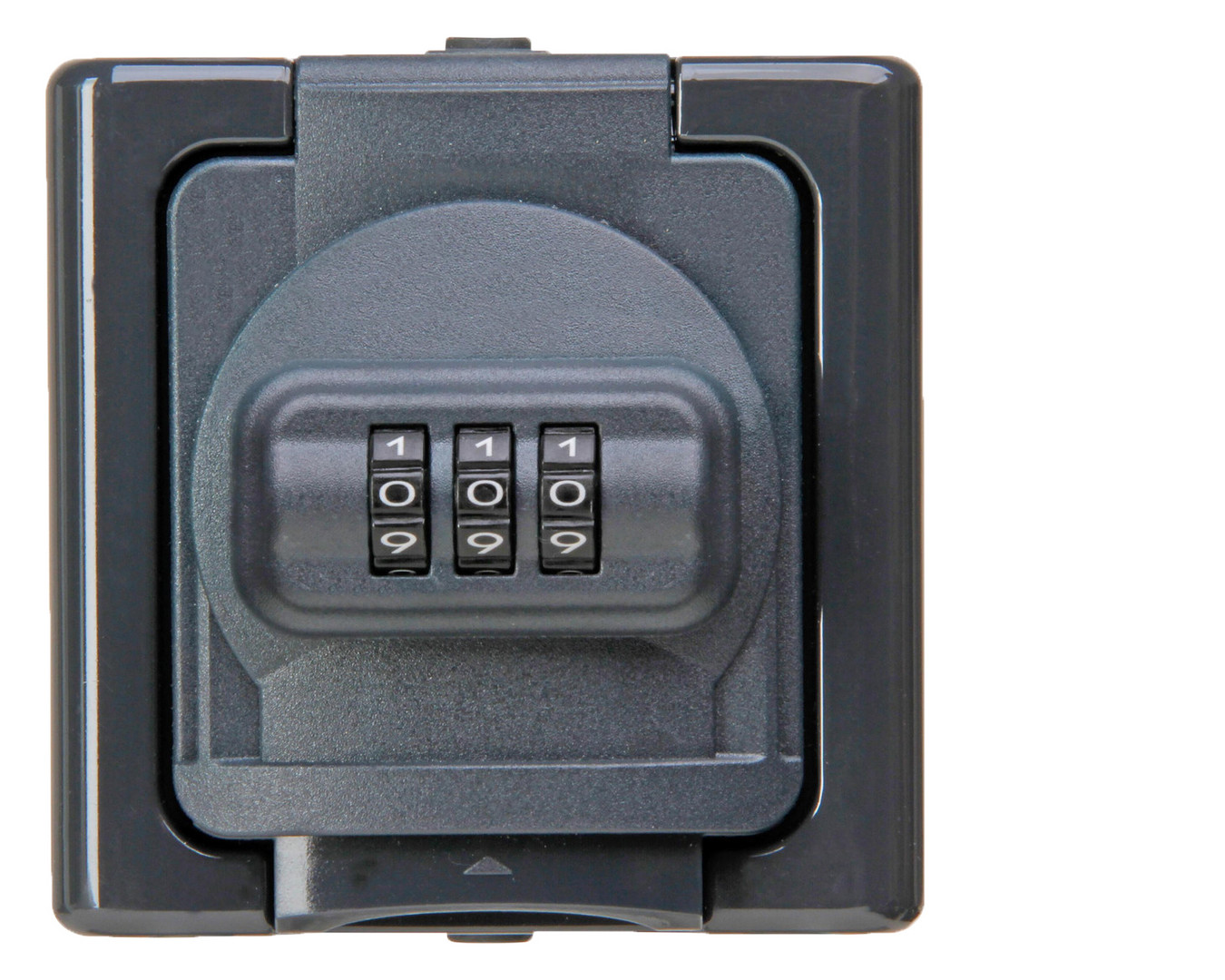 BLUE ELECTRIC - Aufputz-Feuchtraum Schutzkontakt-Steckdose mit Zahlenschloss. Die Sicherheitsverriegelung verhindert die unberechtigte Fremdnutzung, z.B. in Waschküchen. Frei wählbare Kombinationen, kein Schlüssel erforderlich, einfachste Lagerbevorratung, einfache Bedienung. 16A, 250V~, IP44, Farbe: anthrazit