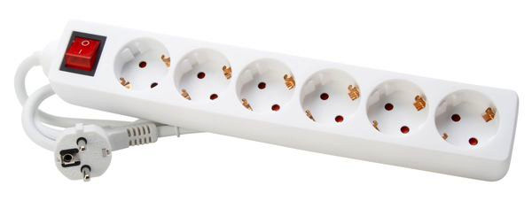 Standard-Steckdosenleiste, 6-fach mit beleuchtetem 2-poligen Schalter, mit 45º gedrehten Töpfen und erhöhtem Berührungsschutz, 16A, 250V~, Zuleitung H05VV-F 3Gx1,5mm²,1,4m, Farbe: arktisweiß