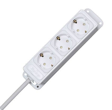 UNOversal 3-fach, mit erhöhtem Berührungsschutz, mit 90° gedrehten Töpfen, Topfabstand 52mm, 5m Zuleitung H05VV-F3G1,5mm², Steckdosenleisten-Länge 213,mm, anschraubbar, Befestigungsabstand 197,5mm, 16A, 250V~, Farbe: arktisweiß