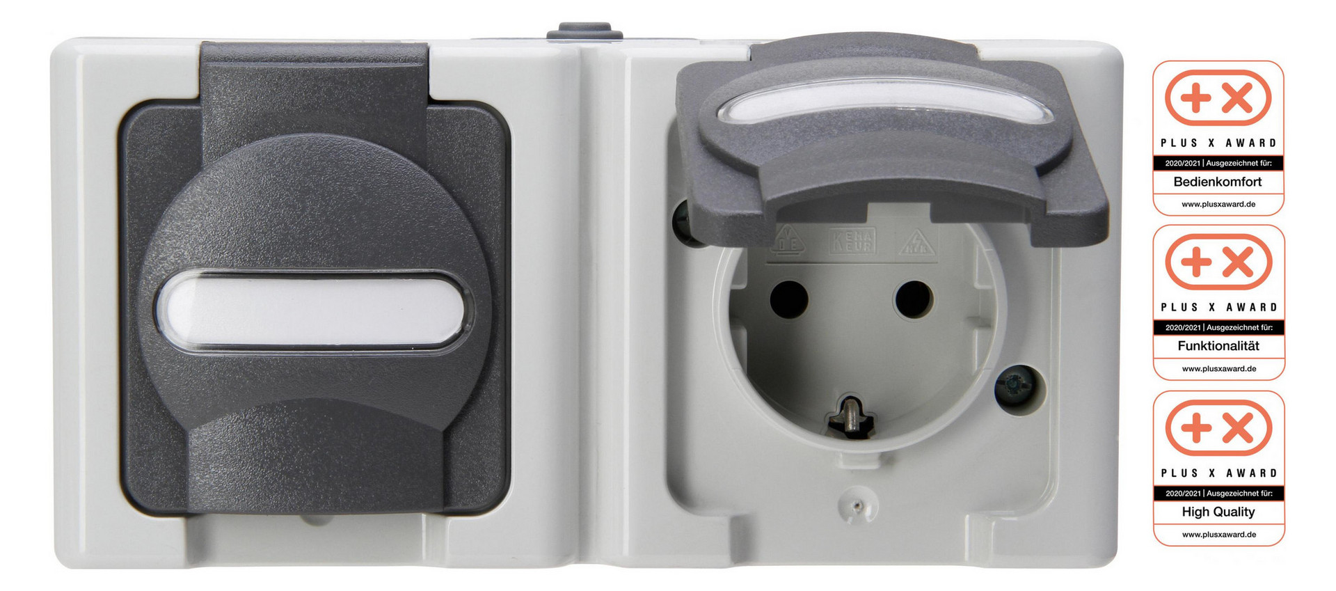 | Kurzbeschreibung | BLUE ELECTRIC - Schutzkontakt-Steckdose mit Klappdeckel, 2-fach, fertig verdrahtet, Farbe: grau |