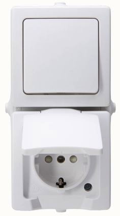 Aufputz-Feuchtraum Aus-/Wechselschalter-Steckdosenkombination im Design NAUTIC und der Farbe arktisweiß in senkrechter Ausführrung. Steckdose mit Nennstrom von 16A. Aus-/Wechselschalter mit einem Schaltvermögen von 10AX. Schutzart IP44