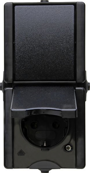 Aufputz-Feuchtraum Aus-/Wechselschalter-Steckdosenkombination im Design proAQA und der Farbe schwarz in senkrechter Ausführung ohne erhöhtem Berührungsschutz,Bemessungsspannung liegt bei 250V~. Schaltvermögendes Schalters liegt bei 10AX und der Nennstrom de r Steckdose liegt bei 16A. Schutzart IP44