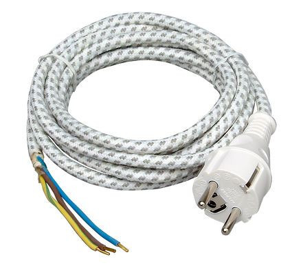 Bügeleisen-Zuleitung, Schutzkontakt-Stecker mit 2 Schutzkontaktsystemen, abgemanteltes Leitungsende mit Aderendhülsen, Textilgeflecht-Leitung H03RT-F 3x0,75mm², 3m, Farbe: weiß/schwarz
