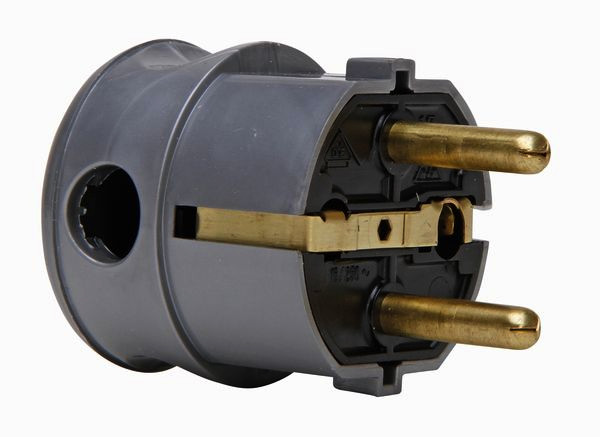 Kunststoff-Schutzkontakt-Winkelstecker - seitliche Einführung, 2 Schutzkontaktsysteme gemäß Norm CEE7/VII, für Kabelquerschnitt bis 3x1,5mm², 16A, 250V~, Durchmesser: 39mm, Höhe ohne Steckerstifte: 38mm, Höhe mit Steckerstiften: 57mm, Schutzart IP20, Farbe: silber