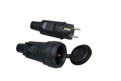 Gummi-Steckverbindungs-Set, Schutzkontakt-Vollgummistecker und Schutzkontakt-Gummikupplung, mit Steckerverriegelung und Spritzwasserkappe, bruchfest, schlagfest, Einsatz: Polyamid, Kappe: Gummi, für Kabelquerschnitte bis 3x2,5mm², 16A, 250~, Schutzart IP44, Farbe: schwarz
