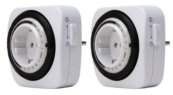 Tageszeitschaltuhr kompakt, mit erhöhtem Berührungsschutz, kürzeste Einstellzeit 15 Minuten, max. 96x Ein/Aus pro Tag, manuelles Einschalten, 230V~, 16A, 50 bis 60 Hz, max. 3.500 W, IP20, Inhalt: 2 Stück, Farbe: weiß