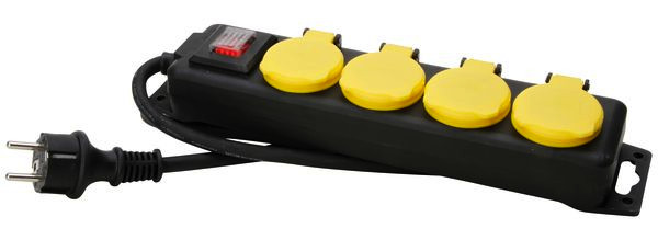 | Kurzbeschreibung | 4-fach Feuchtraum-Steckdosenleiste, Schalter, 45° gedrehte Töpfe mit Deckel, erhöhter Berührungsschutz, Farbe: schwarz/gelb |