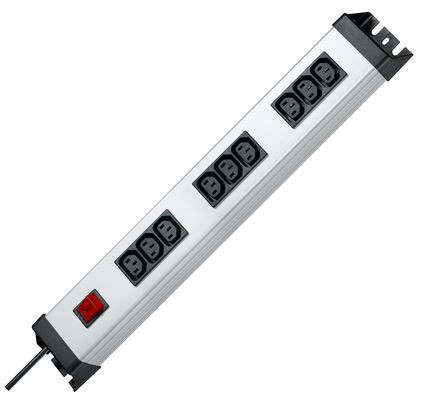 POWERversal 3x3-fach, IEC-C13-Steckplätze (Kaltgerätesteckdosen), 250V~, 10A, max. 2300W, mit 2-poligem beleuchteten Schalter, anschraubbar, wiederanschließbar, Zuleitung H05VV-F3G1,5mm², 1,4m, Maße(lxbxh): (482,6x71x58,3)mm, Schutzart IP20, Farbe: silber-schwarz