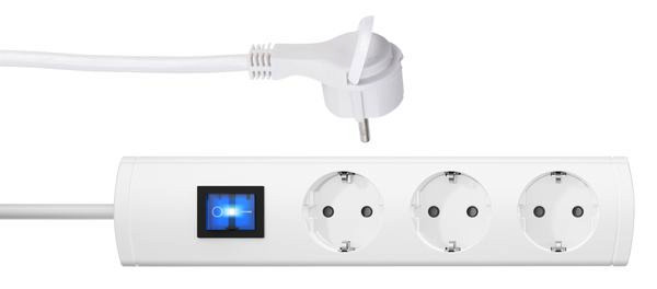 UNOversal Plus, 3-fach, mit extraflachem Winkelstecker (8mm), mit 2- poligem beleuchteten Schalter, mit erhöhtem Berührungsschutz, mit 90° gedrehten Töpfen, Topfabstand 52mm, Zuleitung H05VV-F3G1,5mm², 1,4m, anschraubbar, 16A, 250V~, Farbe: weiß