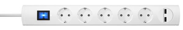 UNOversal Plus, 5-fach, mit 2-fach USB-Ladeport 2100mA, mit 2-poligem beleuchteten Schalter, mit erhöhtem Berührungsschutz, mit 90° gedrehten Töpfen, Topfabstand 52mm, Zuleitung H05VV-F3G1,5mm², 1,4m, anschraubbar, 16A, 250V~, Farbe: weiß