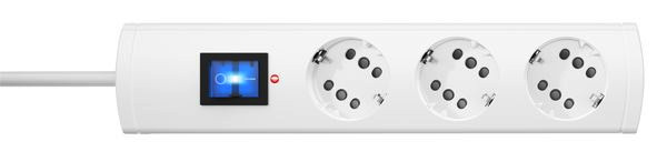 DUOversal Plus, 3=6, mit Geräteschutz-Überspannungsfilter, optische Ausfallanzeige nach Überspannungsschaden, je Steckdosentopf Anschlussmöglichkeit für einen Schutzkontakt- oder zwei Eurostecker, mit 2-poligem beleuchteten Schalter, mit erhöhtem Berührungsschutz, mit 35° gedrehten Töpfen, Topfabstand 52mm, Zuleitung H05VV-F3G1,5mm², 1,4m, anschraubbar, 16A, 250V~, Farbe: weiß